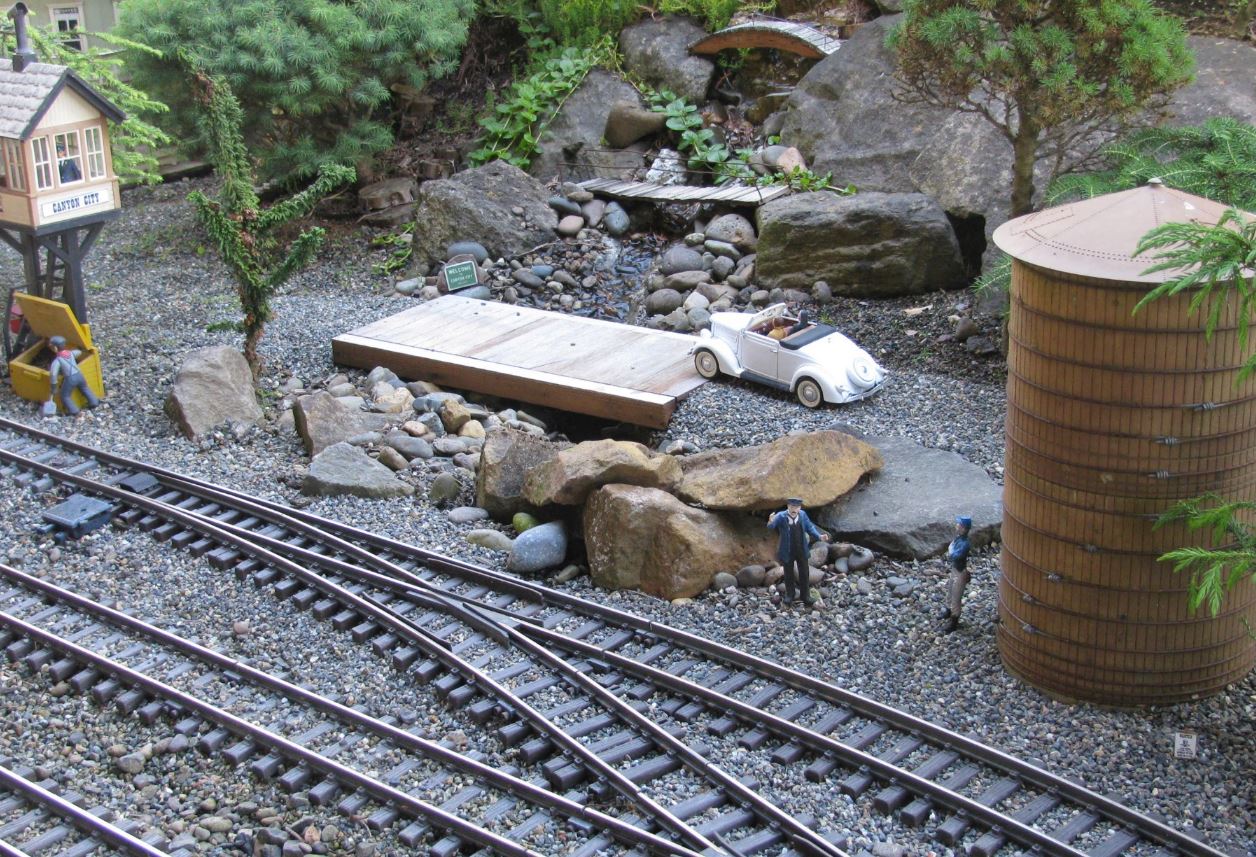 | In front of the house the main line makes a graceful loop around the yard on a beautiful poured concrete viaduct. |